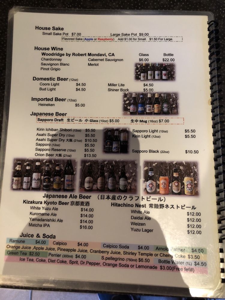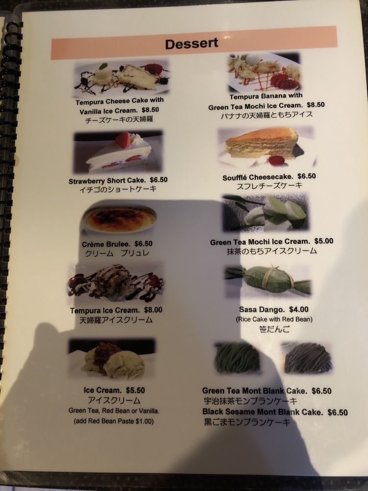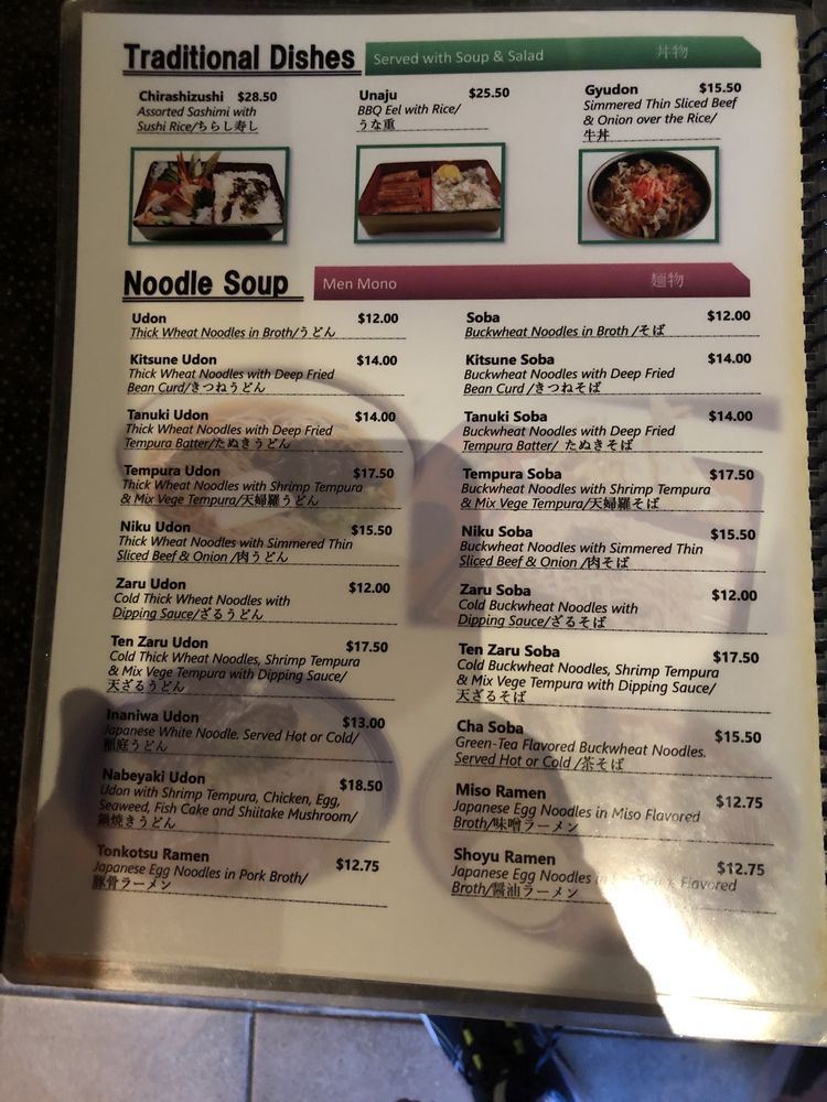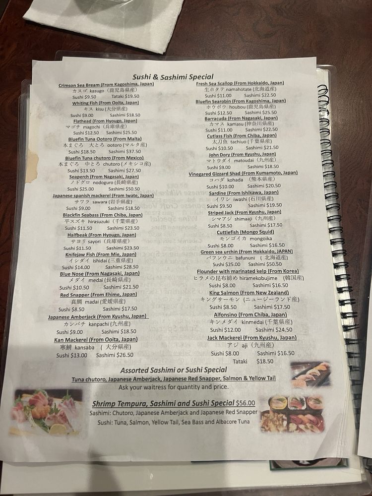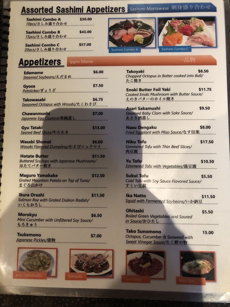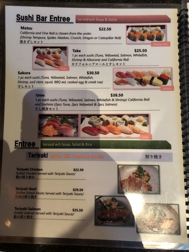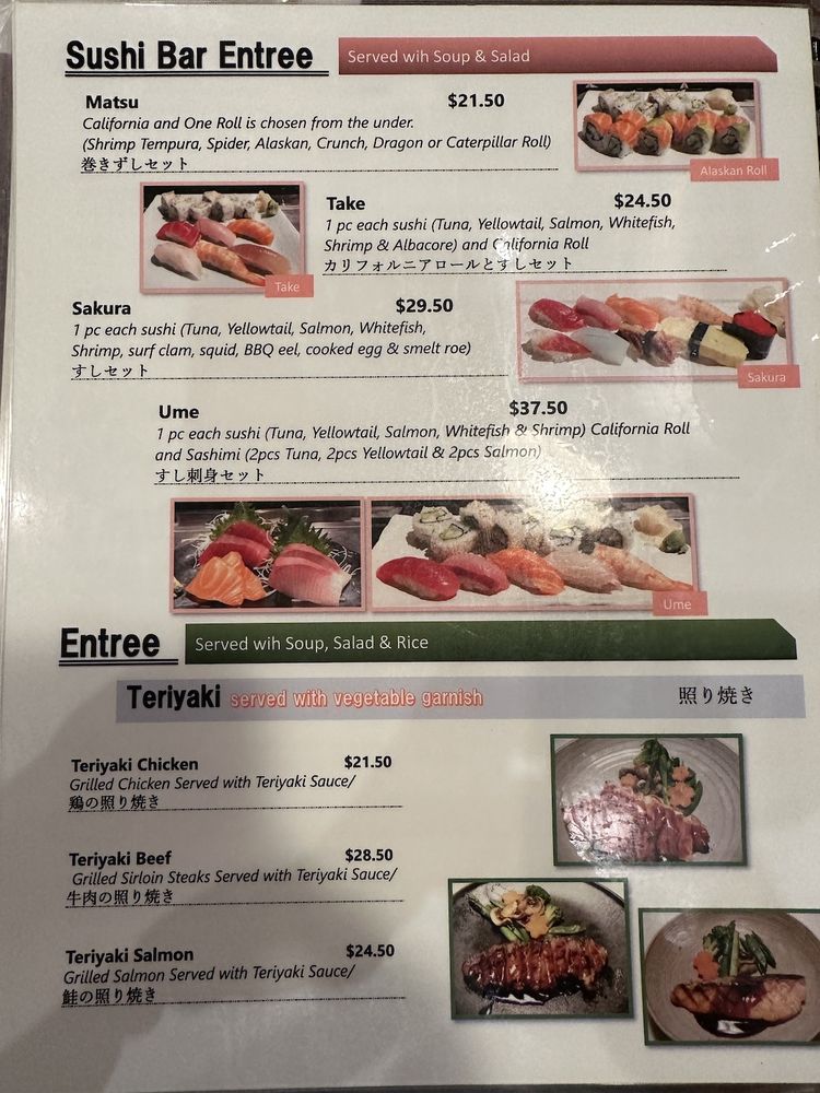 Tempura: shrimp and veg, sashimi: tuna, salmon and albacore tuna, sushi: tuna, salmon, white fish and California roll. Served with soup and salad.