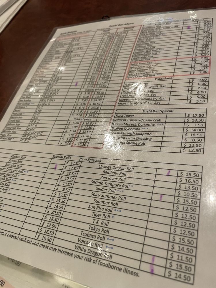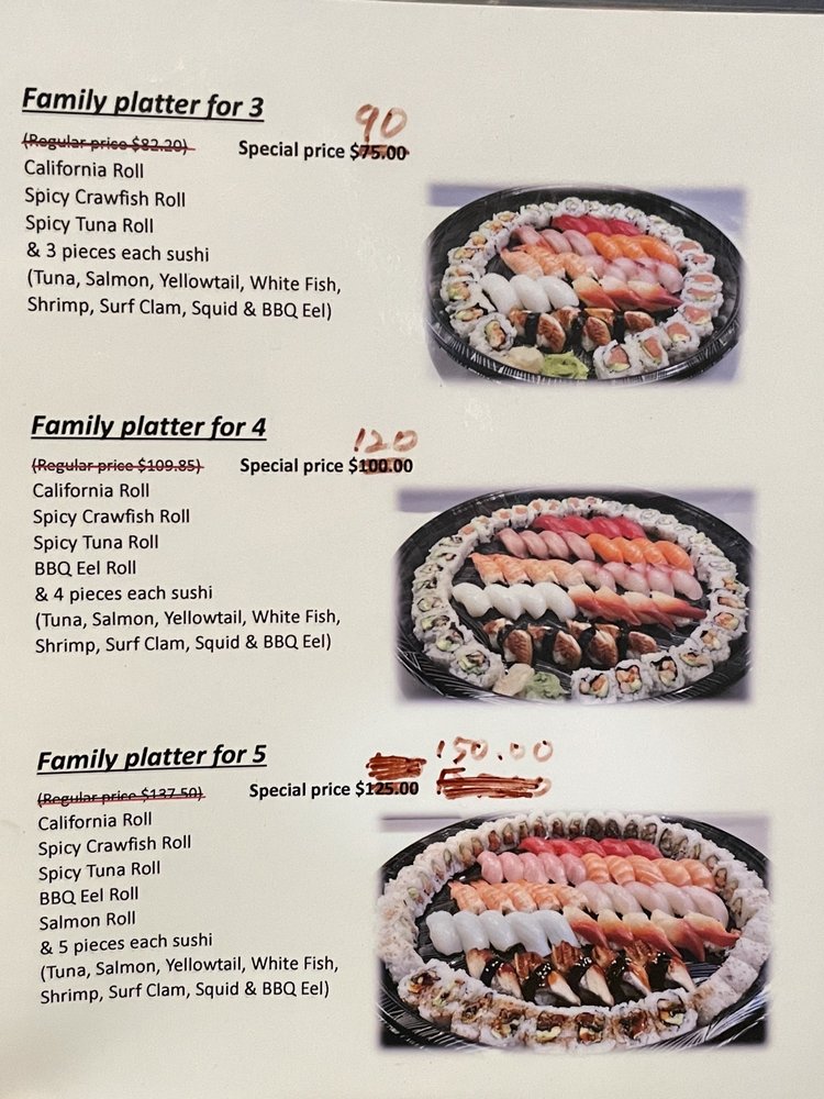 Sushi and roll. California roll, spicy crawfish roll, spicy tuna roll, and 3 pieces each sushi tuna, salmon, yellowtail, white fish, shrimp, surf clam, squid, and BBQ eel.